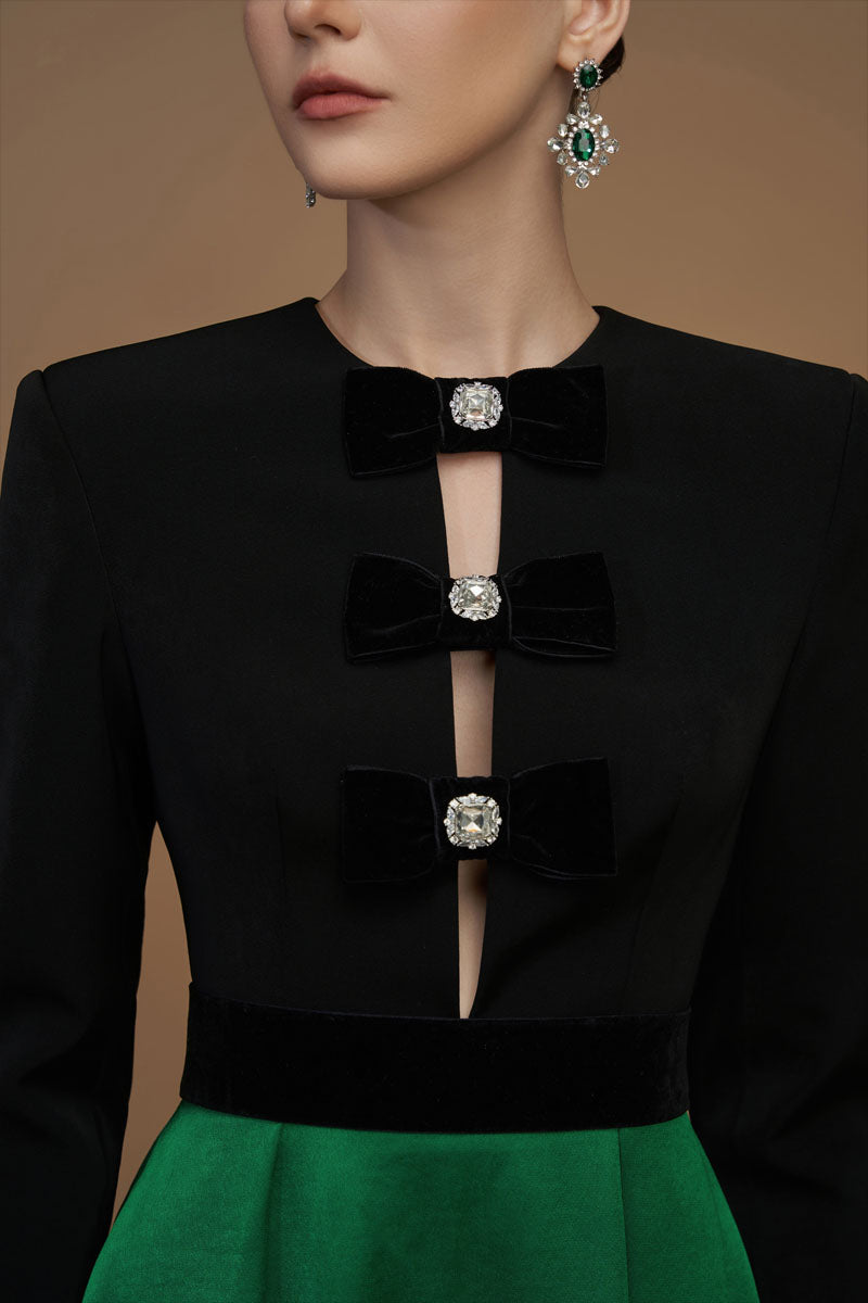 A sophisticated black and emerald green gown featuring a structured velvet-detailed bodice with jeweled bow accents and a flowing satin skirt. The contrast of textures and colors evokes regal charm and timeless couture elegance.