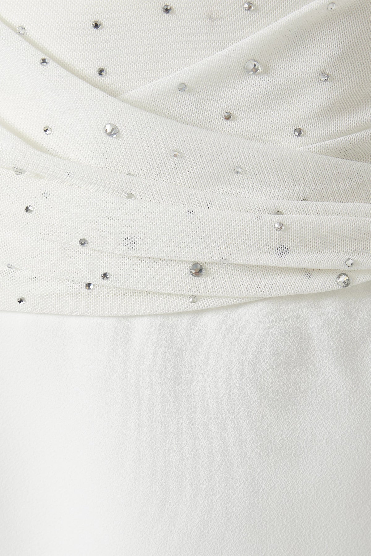 Elegant ivory gown adorned with delicate crystal embellishments, featuring soft draping along the bodice, a subtle front slit neckline, and a cinched waistband for a graceful, statuesque silhouette.