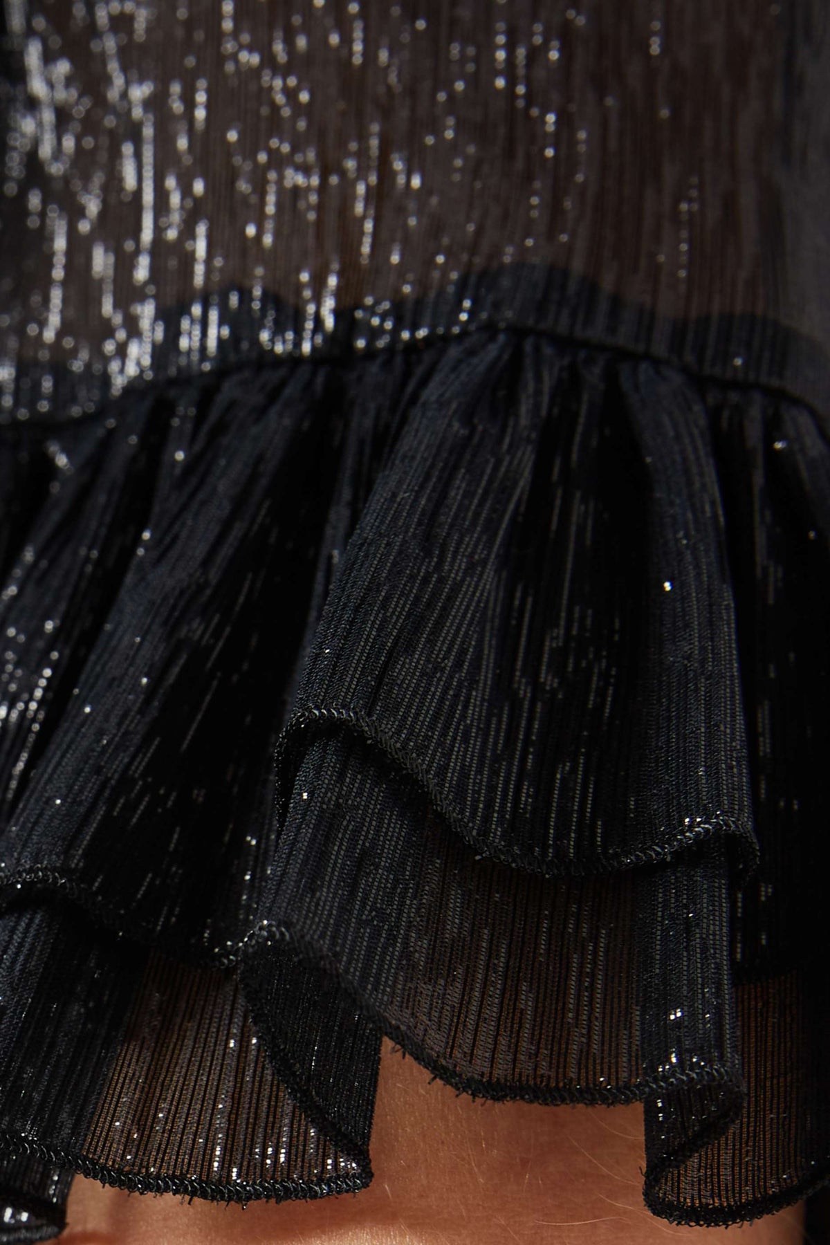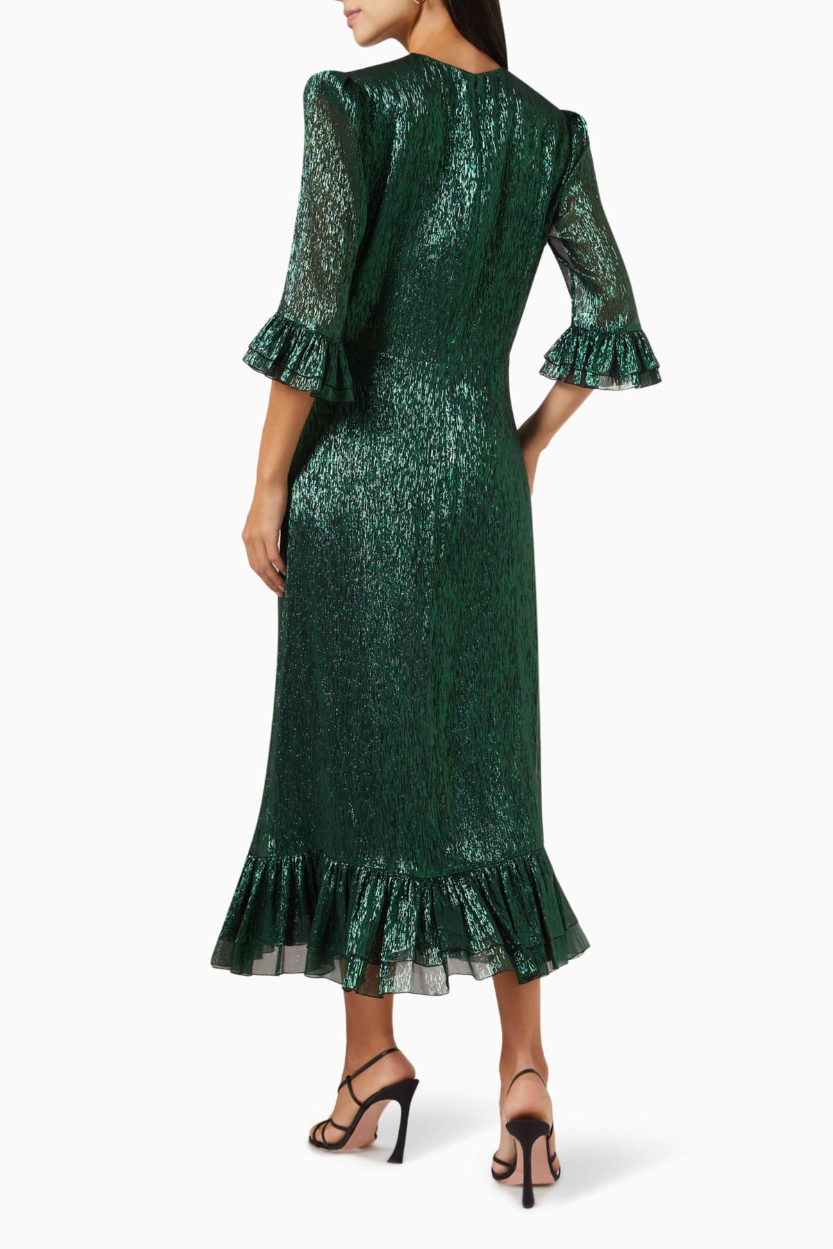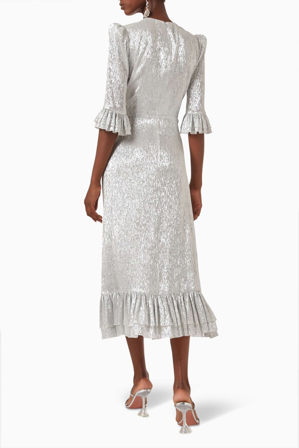Sophisticated silver midi dress featuring subtle shimmer, structured shoulders, and playful ruffle trims on the sleeves and hem—perfect for elegant soirées and festive evenings.
