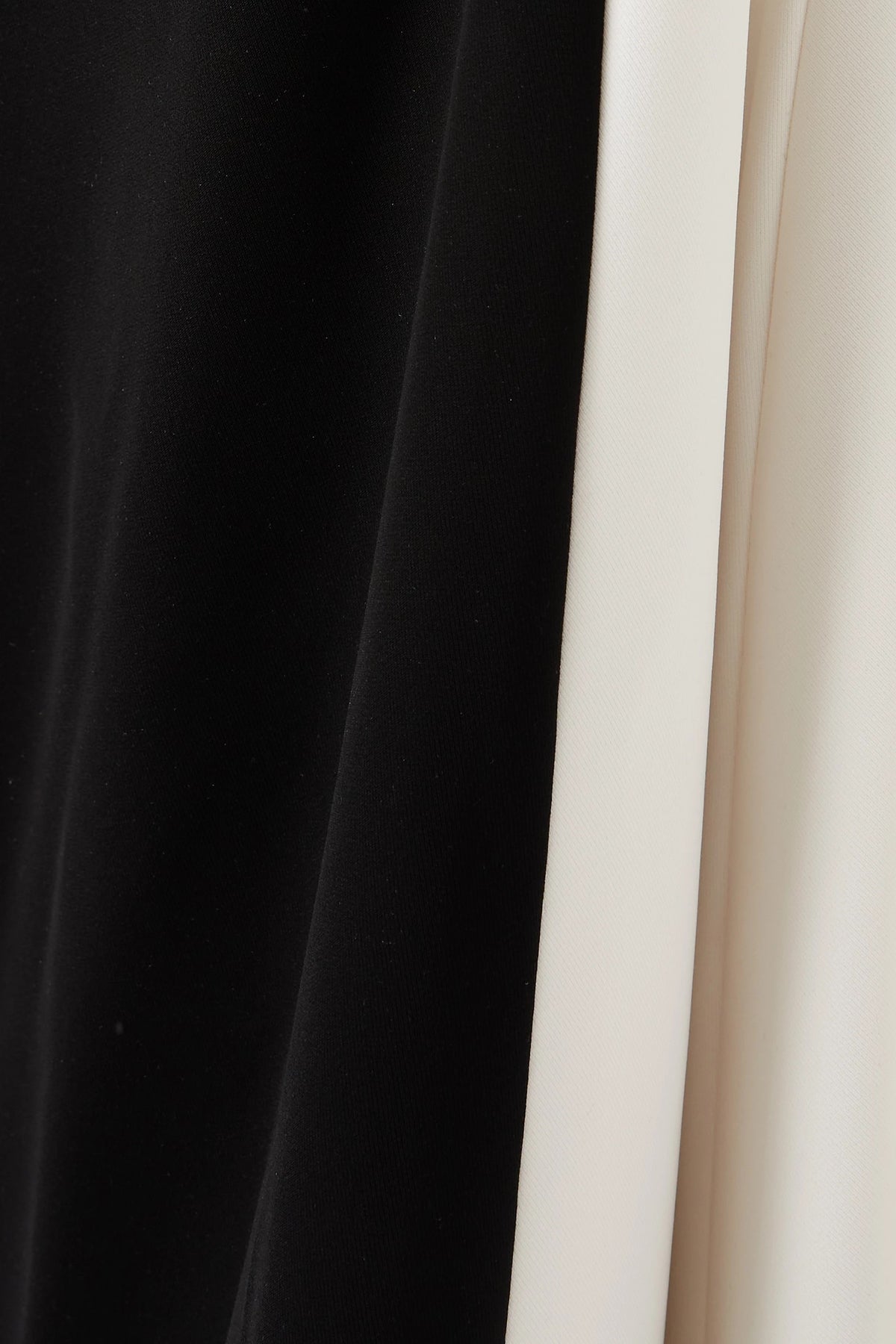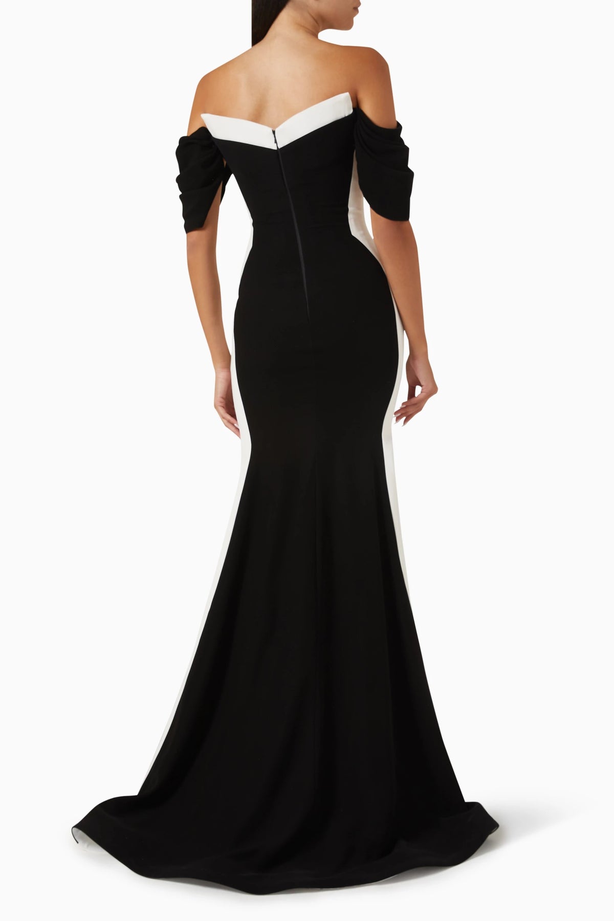 A captivating black and white off-shoulder gown featuring a sculpted sweetheart neckline and draped sleeves. The sleek mermaid silhouette and contrasting side panels create an effortlessly elegant and modern evening look.