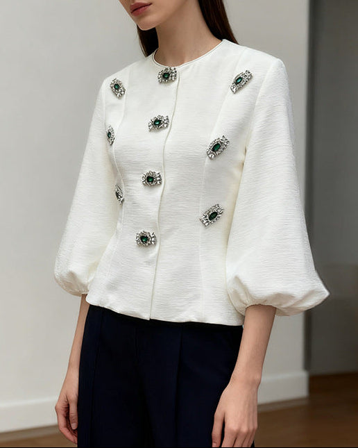 A structured black top featuring voluminous puff sleeves and intricate crystal floral embellishments with emerald-green centers. Elegant and sophisticated, it adds a touch of sparkle perfect for evening wear or chic occasions.