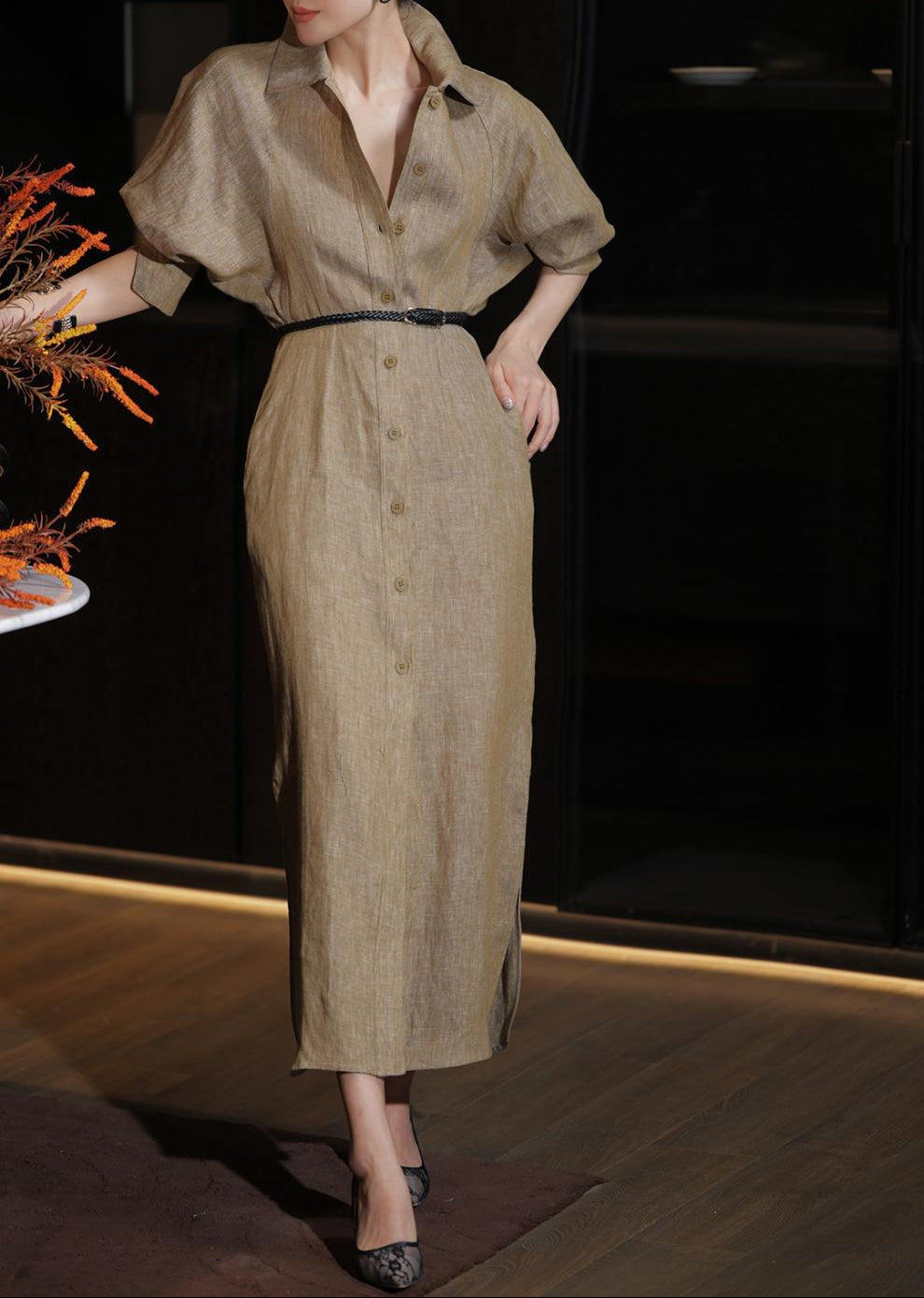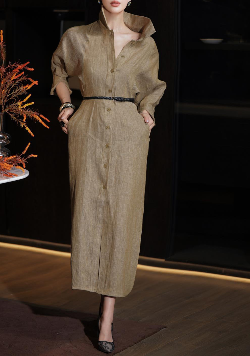 A lightweight denim shirt dress designed with a soft structured collar, full button-down front, and relaxed sleeves for effortless chic. Finished with a slim waist belt to define the silhouette, making it perfect for casual elegance from day to night.
