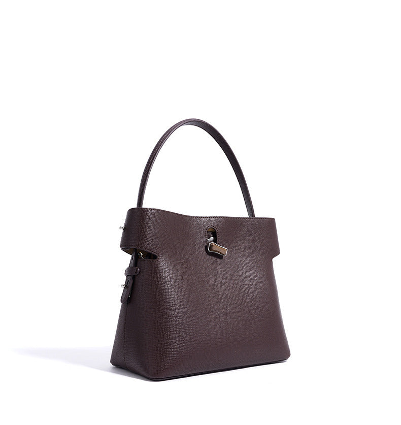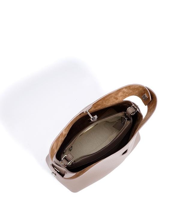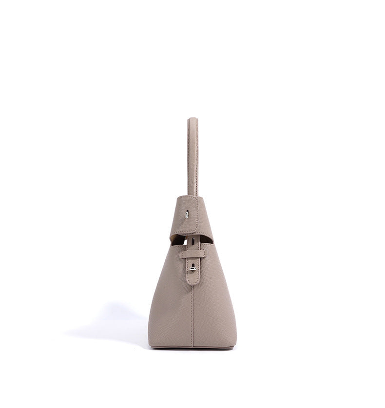 Een slanke en gebeeldhouwde halve maan schoudertas met een afneembare riem en een zacht, gebogen ontwerp. Gemaakt van glad leer met een veilige bovenritssluiting, voegt het een artistiek tintje toe.
