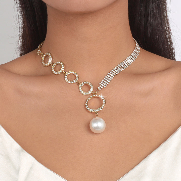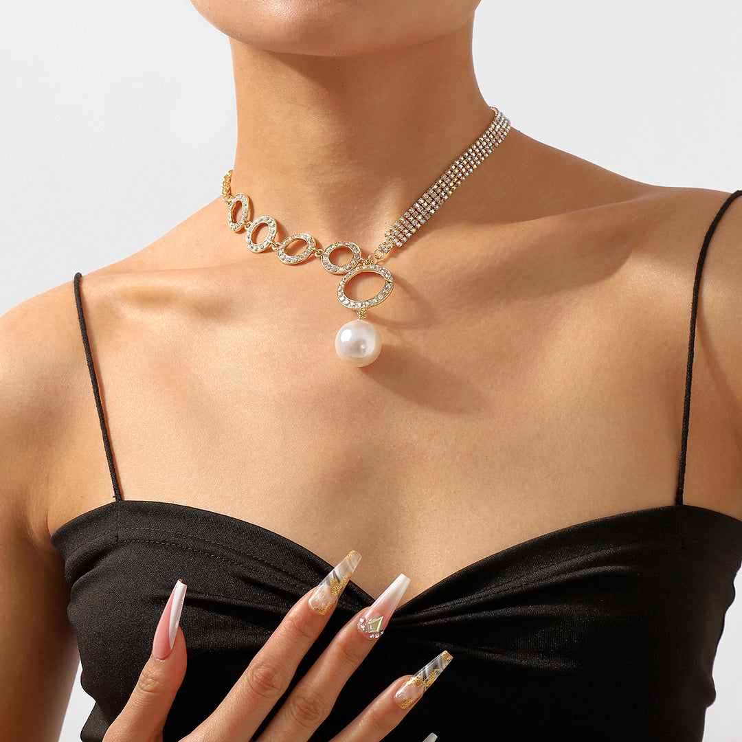 Make a statement with the CELESTE choker, featuring asymmetric crystal-lined loops and a bold pearl drop. Its mix of rhinestone rows and golden accents delivers modern elegance with a touch of vintage glam.