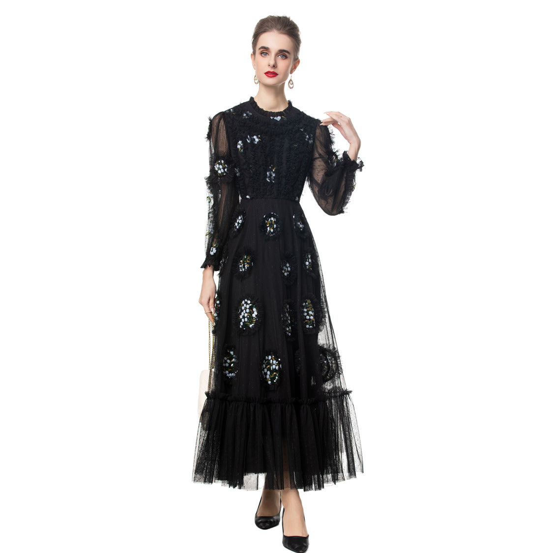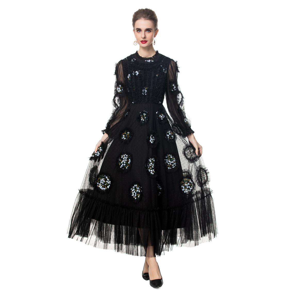 An enchanting black tulle gown featuring intricate floral bead embellishments and soft layered mesh detailing. The sheer sleeves and voluminous skirt exude elegance, making it a perfect statement piece for evening soirées.