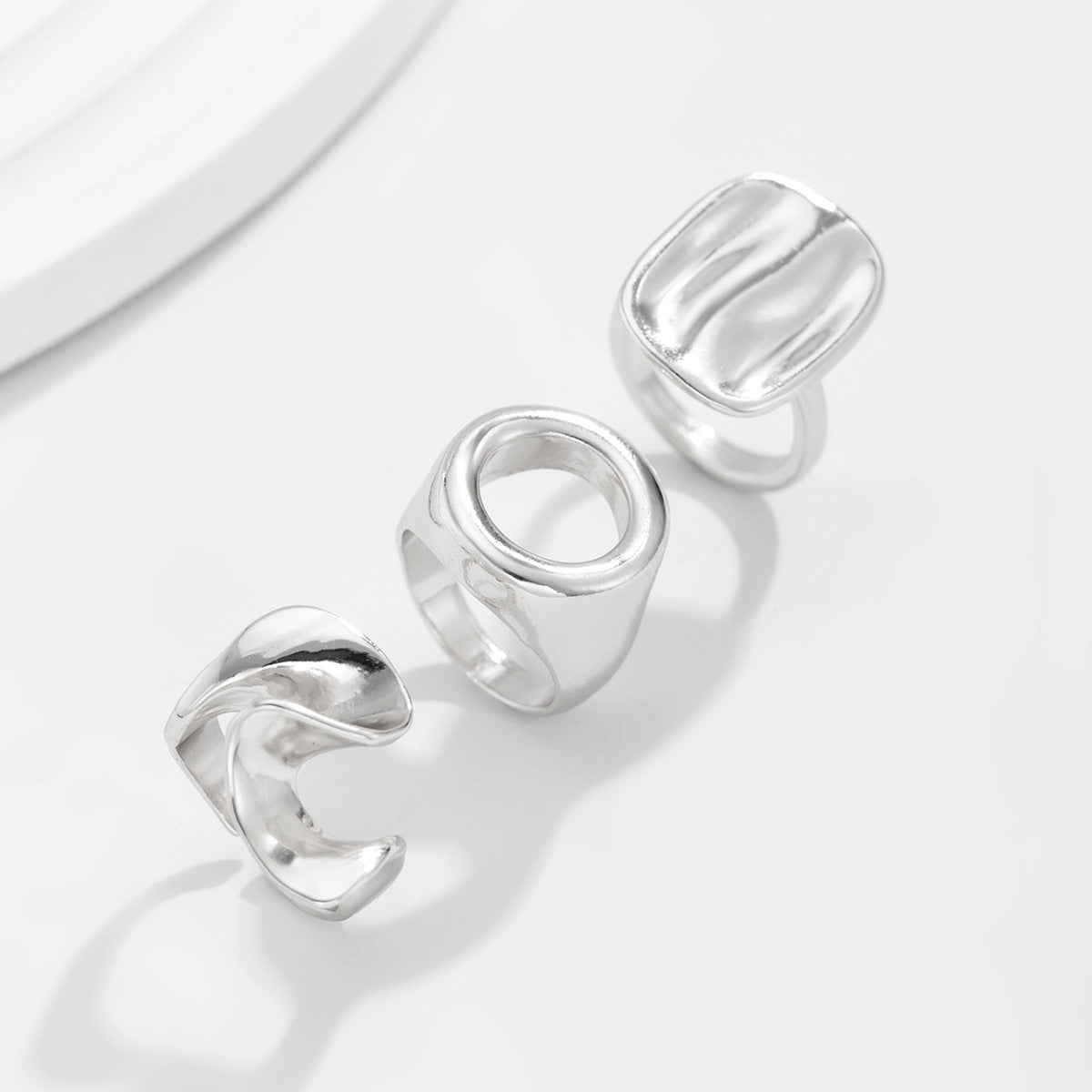 A collection of bold, sculptural rings crafted in lustrous gold and silver tones. Each ring features a unique abstract design, from soft curves to geometric shapes, adding a distinctive touch to any look. Perfect for wearing alone or as a stack, these rings effortlessly blend modern art with everyday elegance.