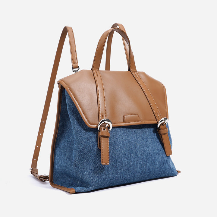 Casual meets refined in this two-tone backpack featuring a structured tan leather flap over a denim body. Finished with adjustable buckle straps and a top handle, it’s the perfect blend of function and street-ready style.