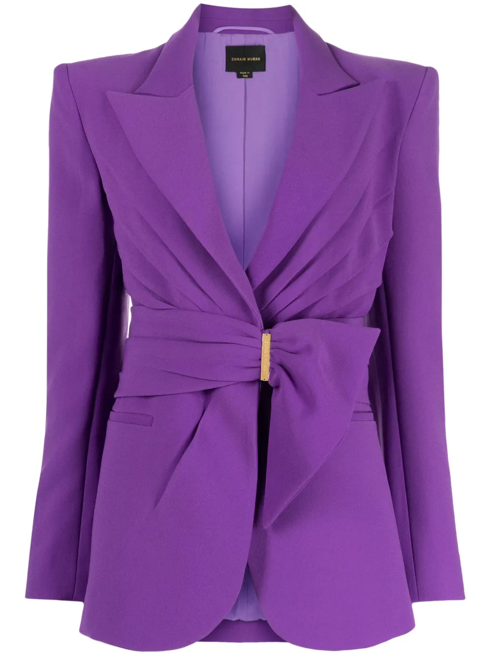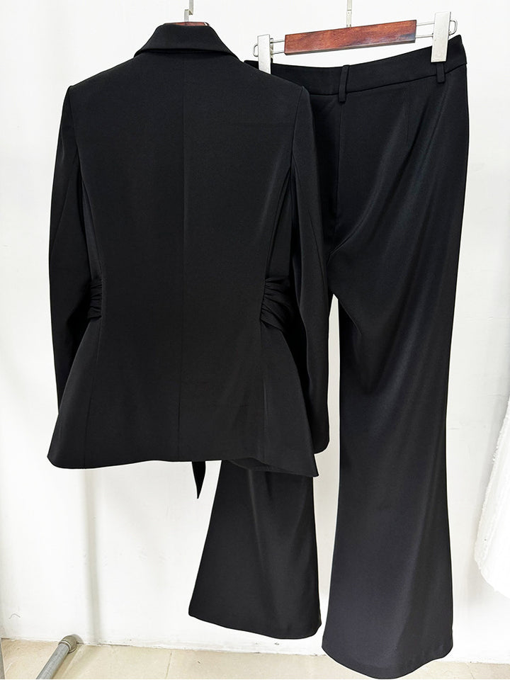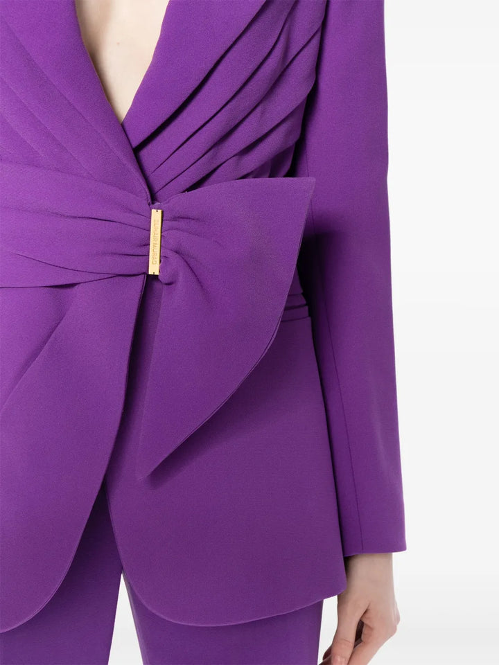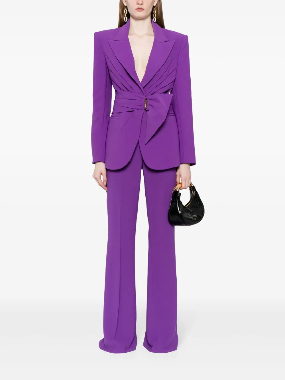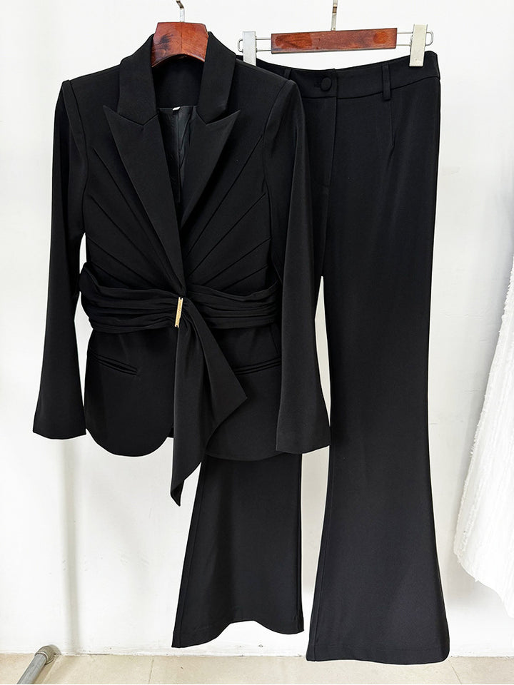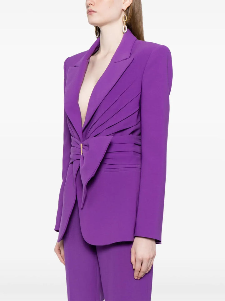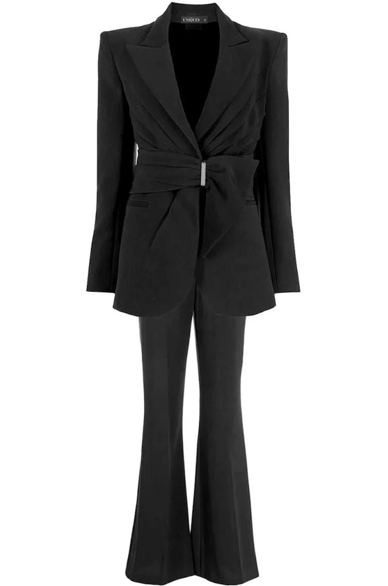 A vibrant two-piece suit that blends elegance with a modern touch. This tailored blazer features sharp lapels and soft pleats that wrap around an attractive front tie, finished with a distinctive metal belt for a sleek look. Pair with matching wide-leg trousers for a longer, bolder look for any occasion. Perfect for formal wear, evening events, or a standout look at any elegant gathering.