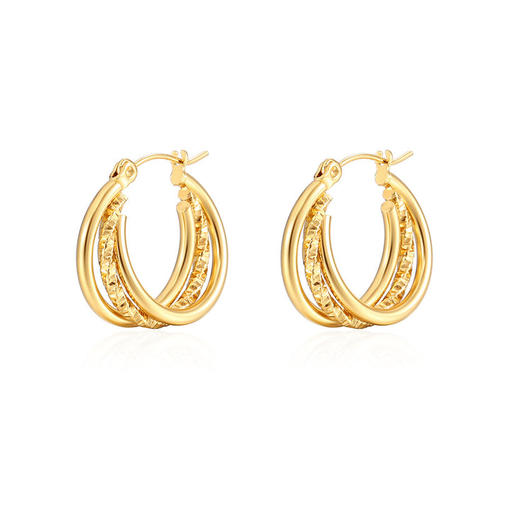 These elegant gold-toned earrings feature a double-hoop design with intricate etched detailing on the inner curve, adding depth and texture to a classic silhouette. Perfect for elevating both everyday and evening looks with a touch of vintage charm.