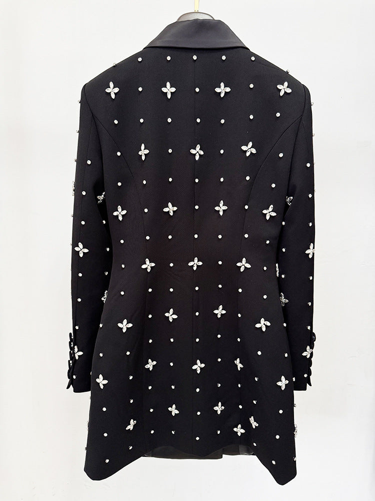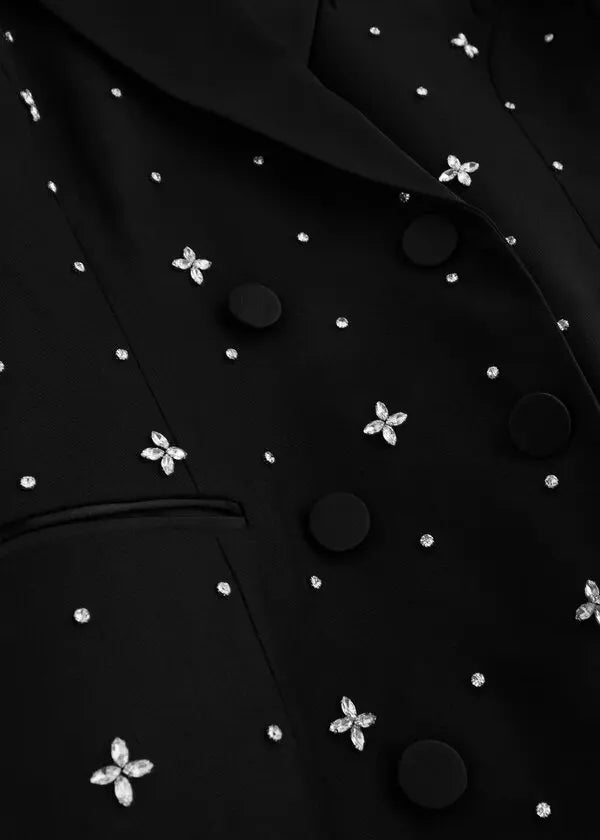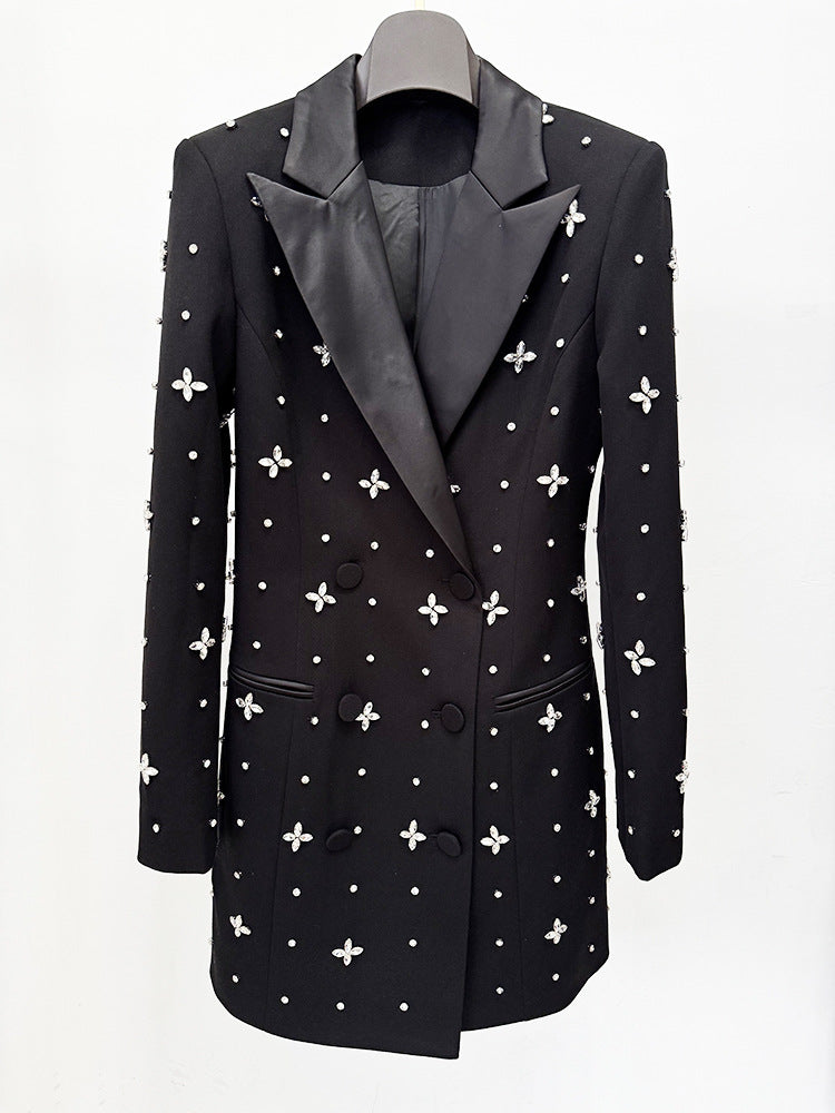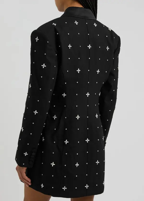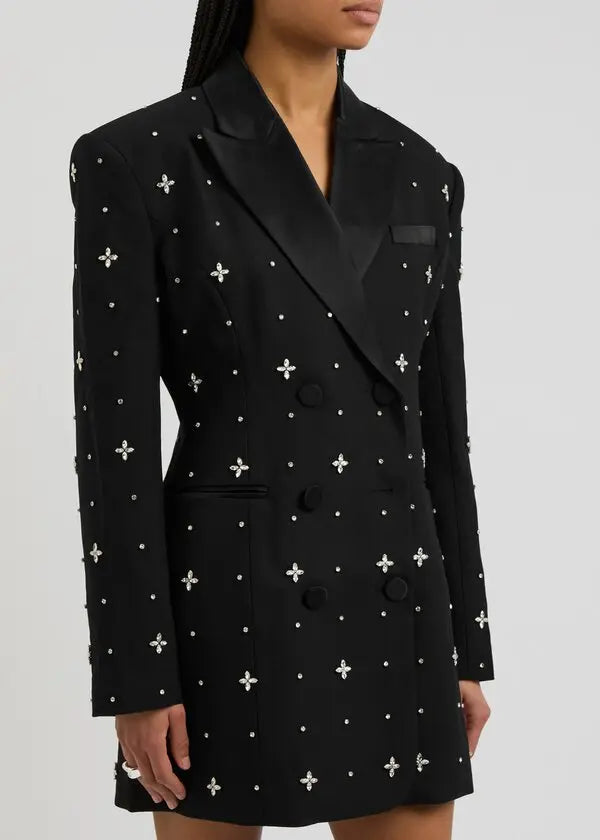 Bold sophistication meets modern sparkle in this statement blazer jacket. Designed in a structured, double-breasted silhouette, this black blazer features sharp shoulders, satin lapels, and all-over crystal embellishments arranged in a chic cross motif. The tailored fit flatters the waist while the mini length adds a playful, fashion-forward edge. Perfect as a standalone dress or styled over slim trousers for a powerfully polished look.