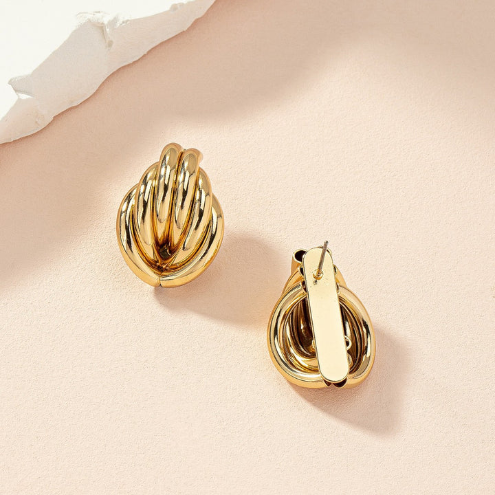 These sculptural gold-tone earrings feature an elegant cluster of interwoven curved bands that create a voluminous teardrop silhouette. With their polished finish and dimensional form, they deliver a vintage-inspired yet contemporary statement—perfect for both everyday glam and elevated occasions.