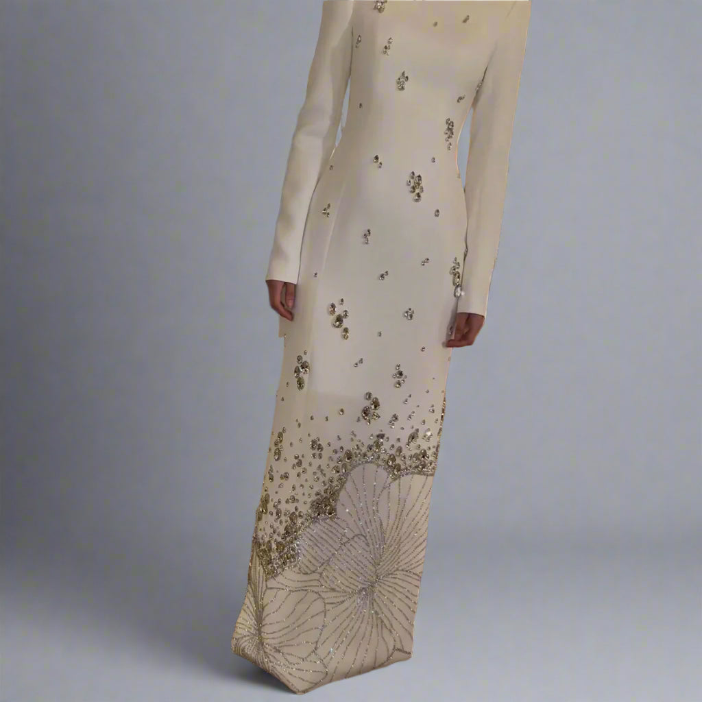 A refined ivory column gown featuring a sleek long-sleeve silhouette with intricate crystal embellishments cascading down the bodice. The hem is detailed with an ornate beaded pattern, adding sophistication and grace—perfect for galas, receptions, and high-profile occasions.