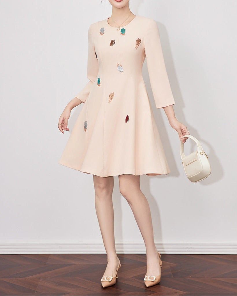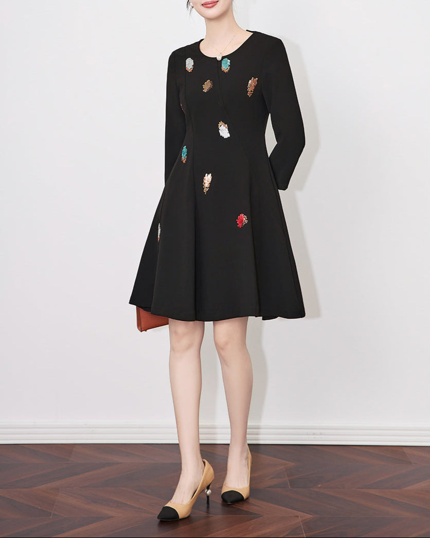 long sleeve fit-and-flare dress with sequin leaf embellishment - DORAX