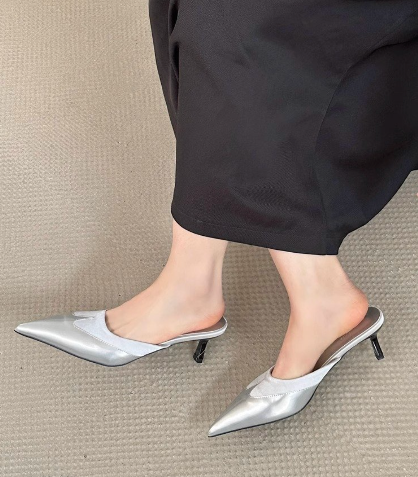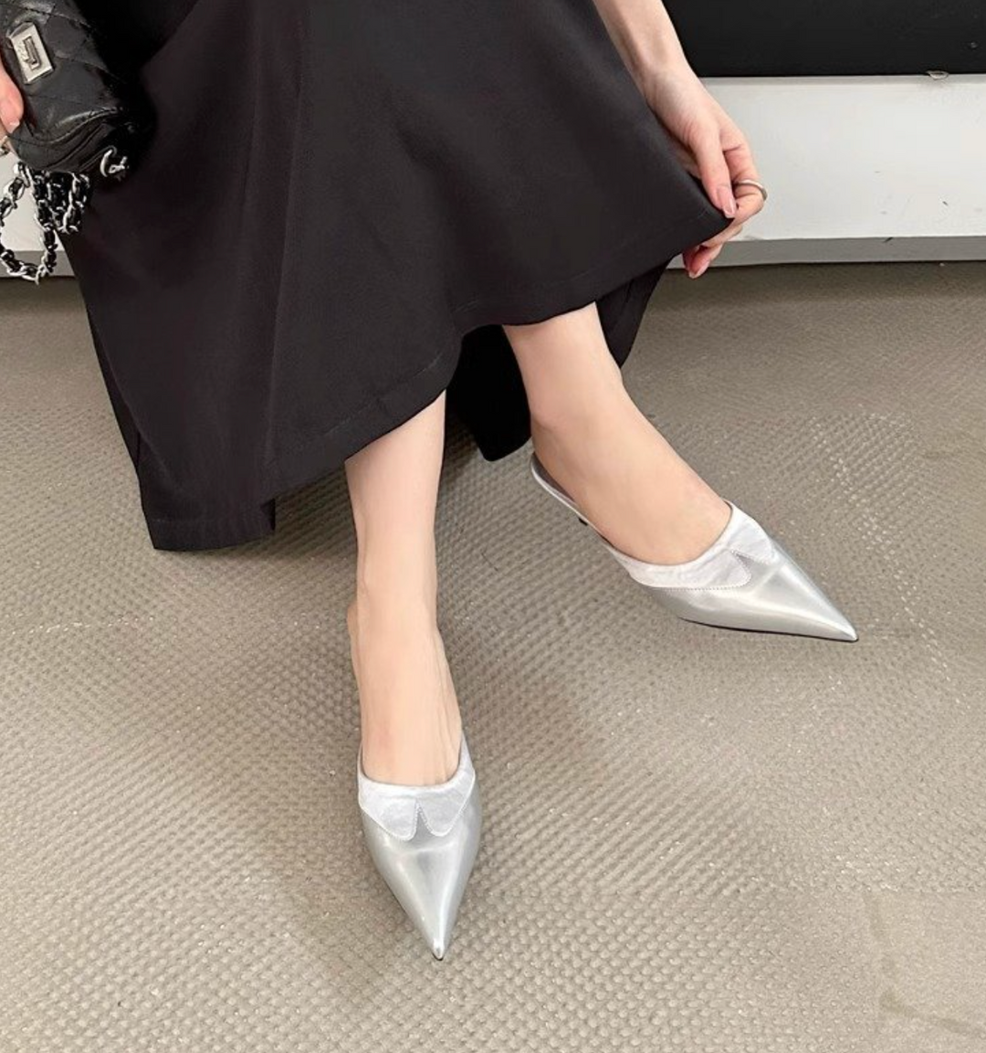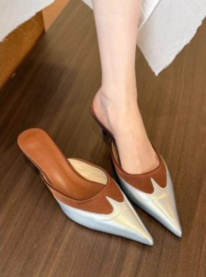 Daring pointed-toe mules featuring a gleaming silver finish contrasted by a tan flame-cut leather insert. A bold yet refined statement for modern fashionistas seeking standout flair.