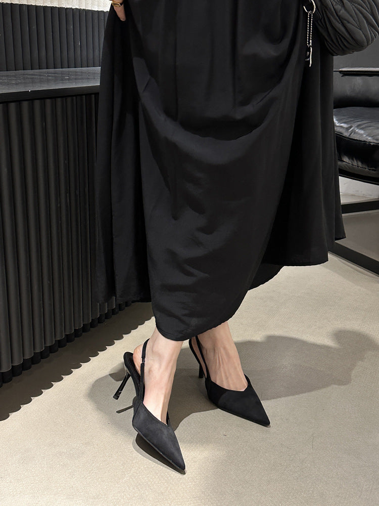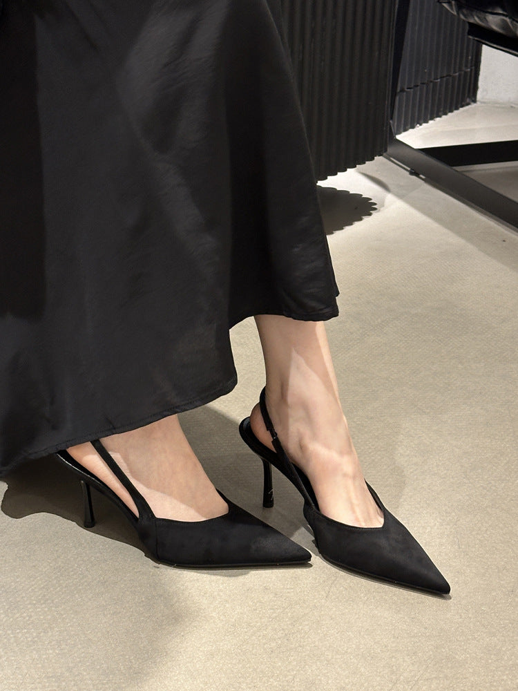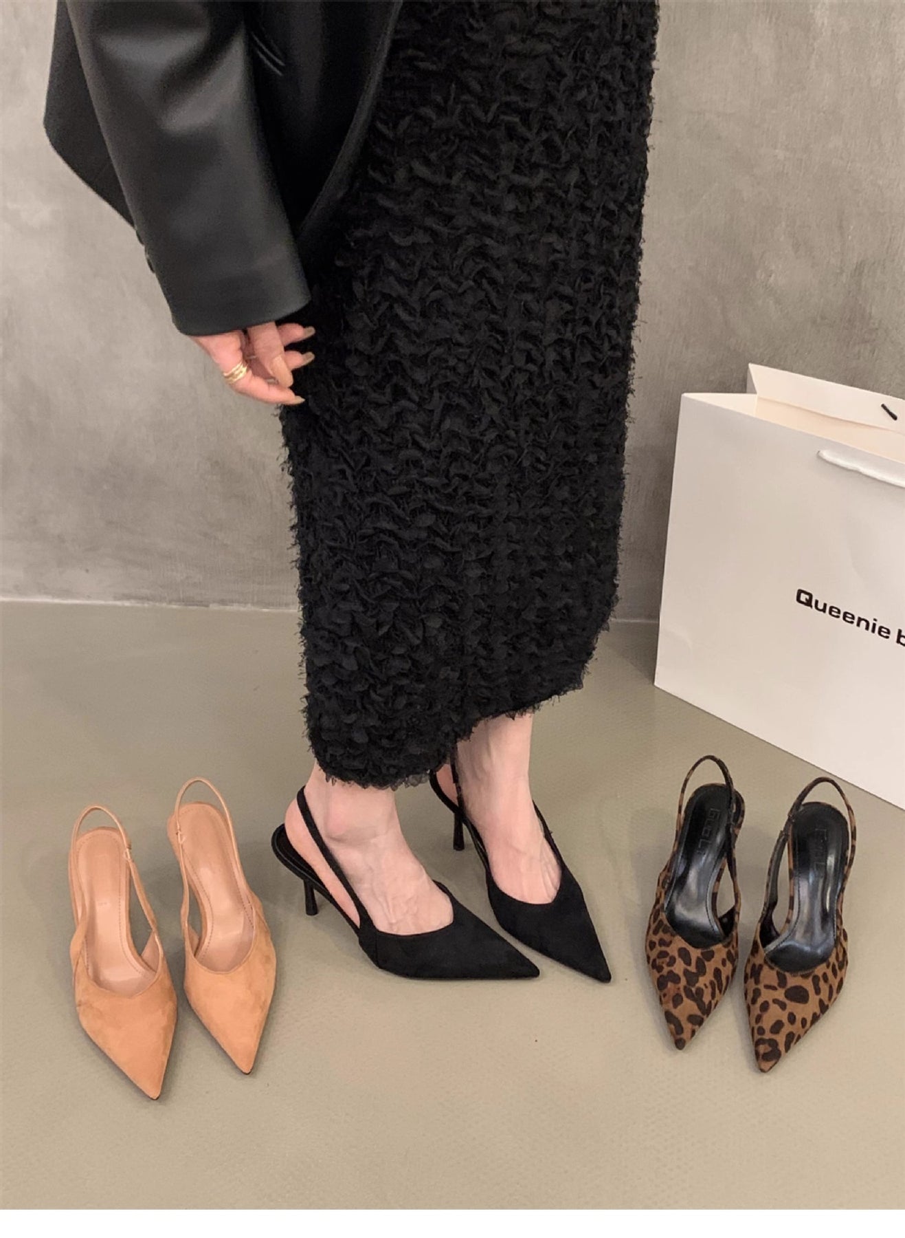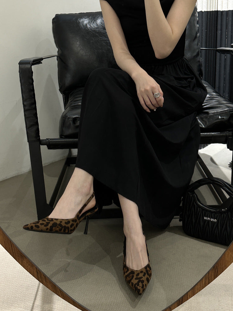Pointed-toe high-heeled pumps. Designed for the confident, fashion-forward woman, these shoes combine elegant black accents with a bold animal print. The bold design elongates the legs, while the strappy back adds a touch of classic charm and ultimate comfort. Perfect for both daytime and evening looks, they're a statement piece for any occasion.