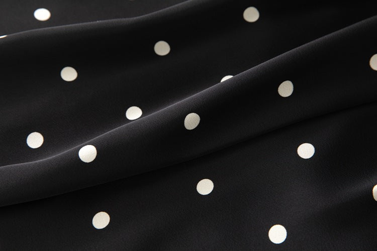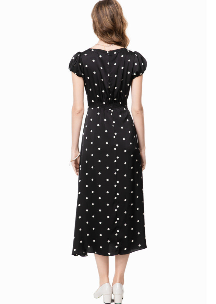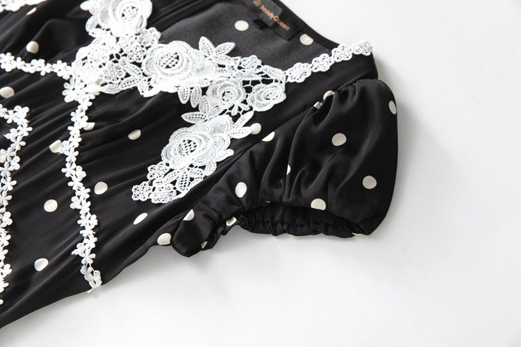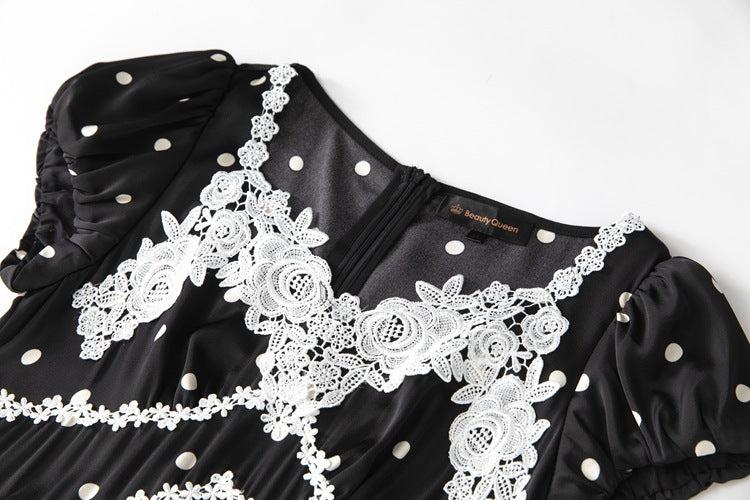 This elegant, classic-inspired black dress features playful white polka dots and intricate lace detailing on the bodice. Its puffy sleeves and wide A-line skirt give it a chic look.