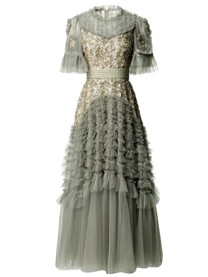 A stunning silver gown featuring a sequin-embellished bodice, sheer flutter sleeves, and a voluminous skirt adorned with cascading tulle ruffles. Elegant and enchanting, it’s the perfect choice for formal occasions, galas, or statement eveningwear.