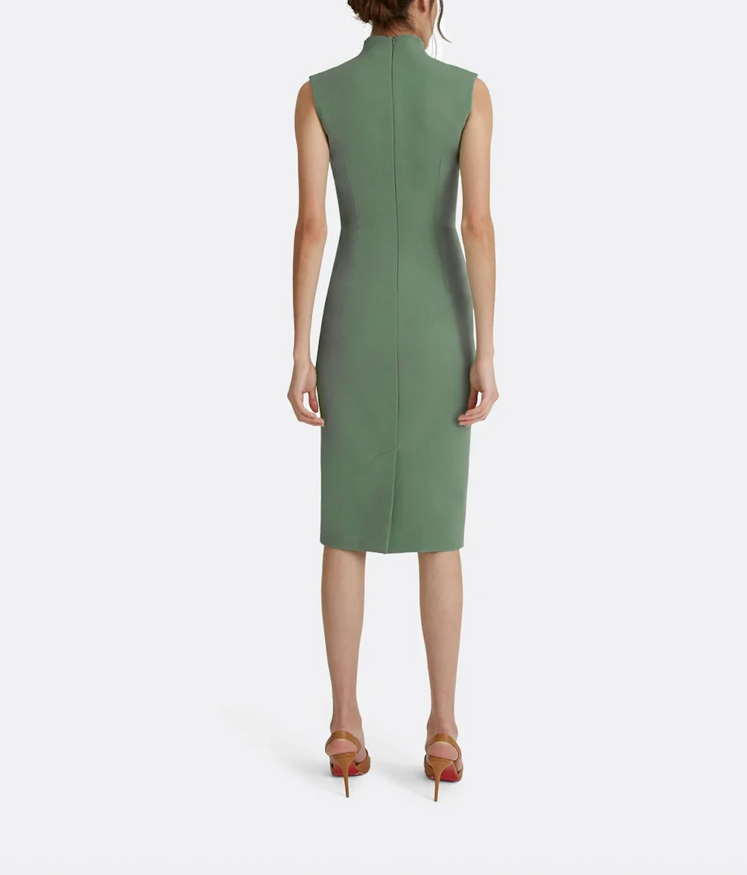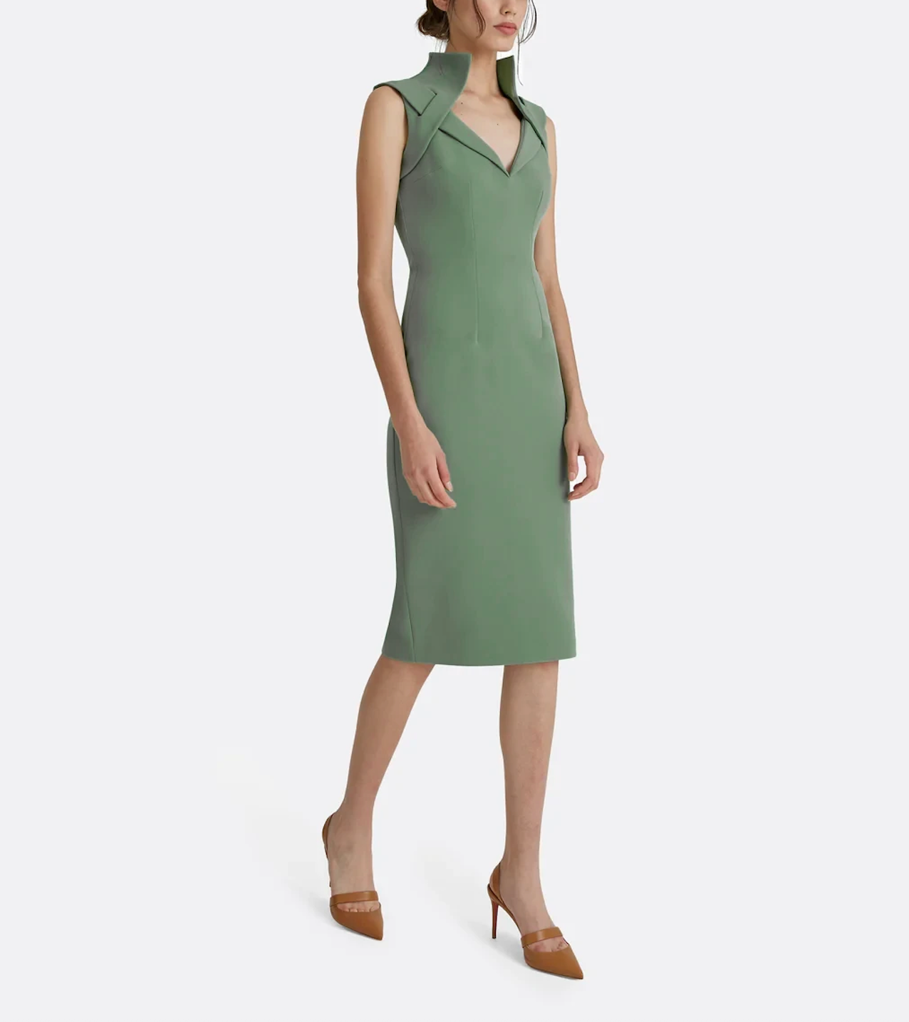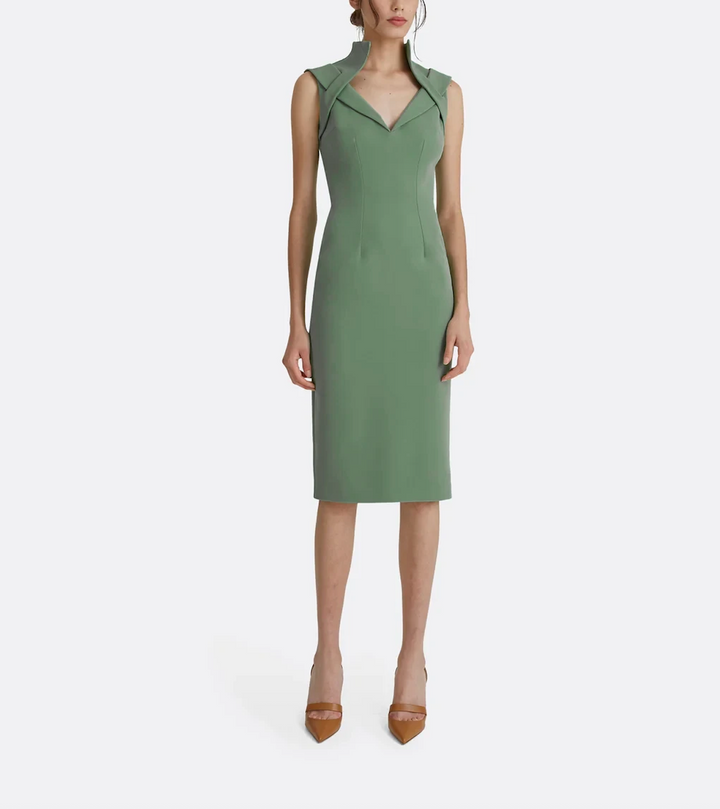 Tailored in a sophisticated olive green, this sleeveless midi dress features a sharply sculpted collar and a sleek, body-skimming silhouette. A modern power look that blends elegance and edge—perfect for polished daytime events or elevated business occasions.