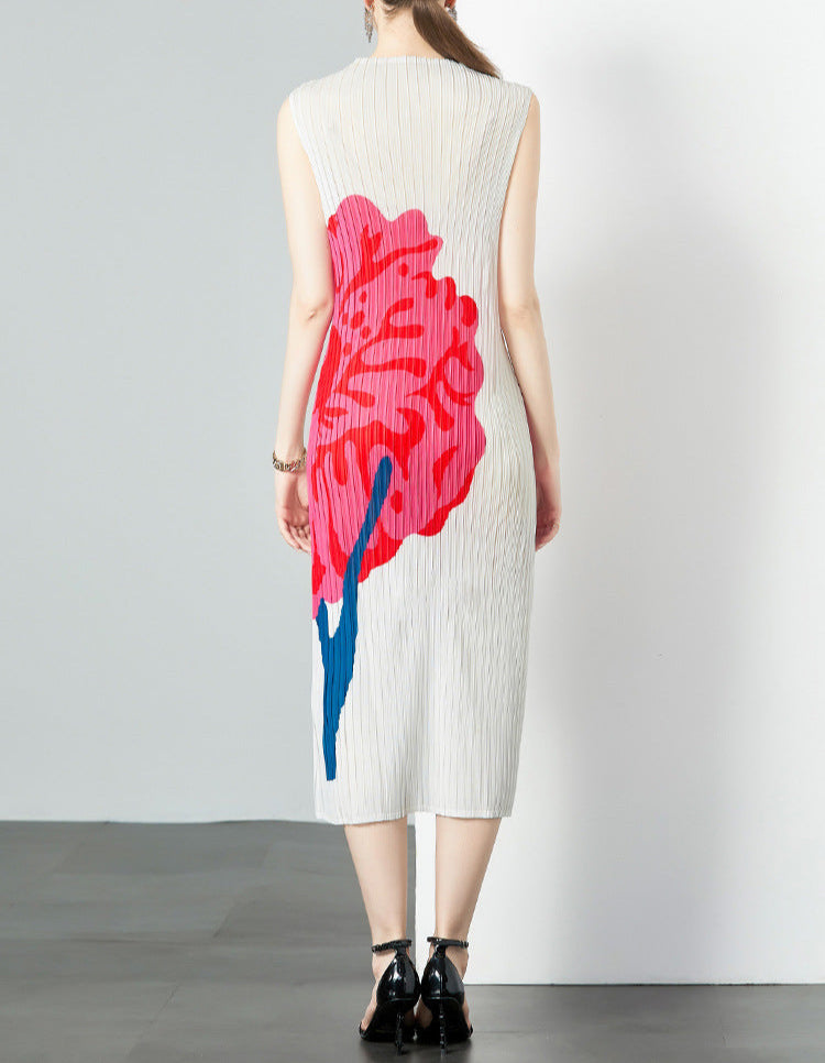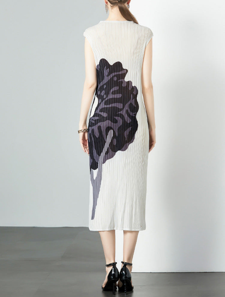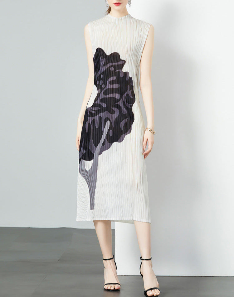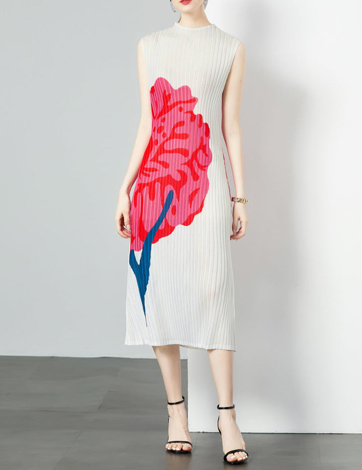 This elegant and modern sleeveless midi dress features delicate pleated fabric and an oversized floral print on a soft ivory base. It features an elegant high neck and a flowing silhouette. Designed for comfort with an artistic touch, it is the epitome of sophisticated simplicity.