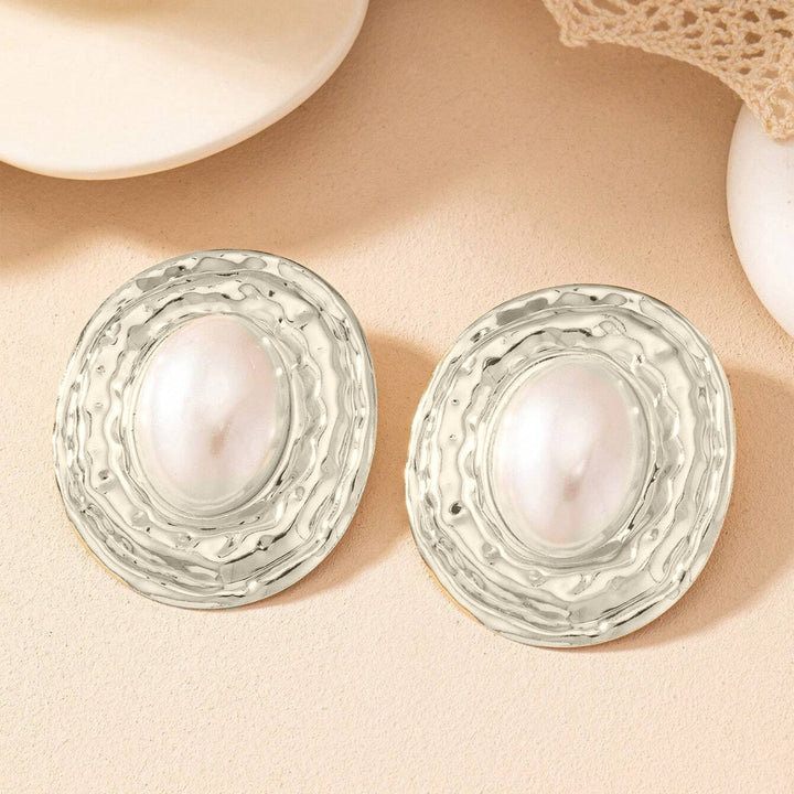 These elegant earrings feature a bold oval silhouette framed by a textured gold-tone setting, perfectly encasing a luminous faux pearl center. The combination of vintage charm and modern craftsmanship makes them a timeless statement piece—ideal for elevating both casual and formal looks.