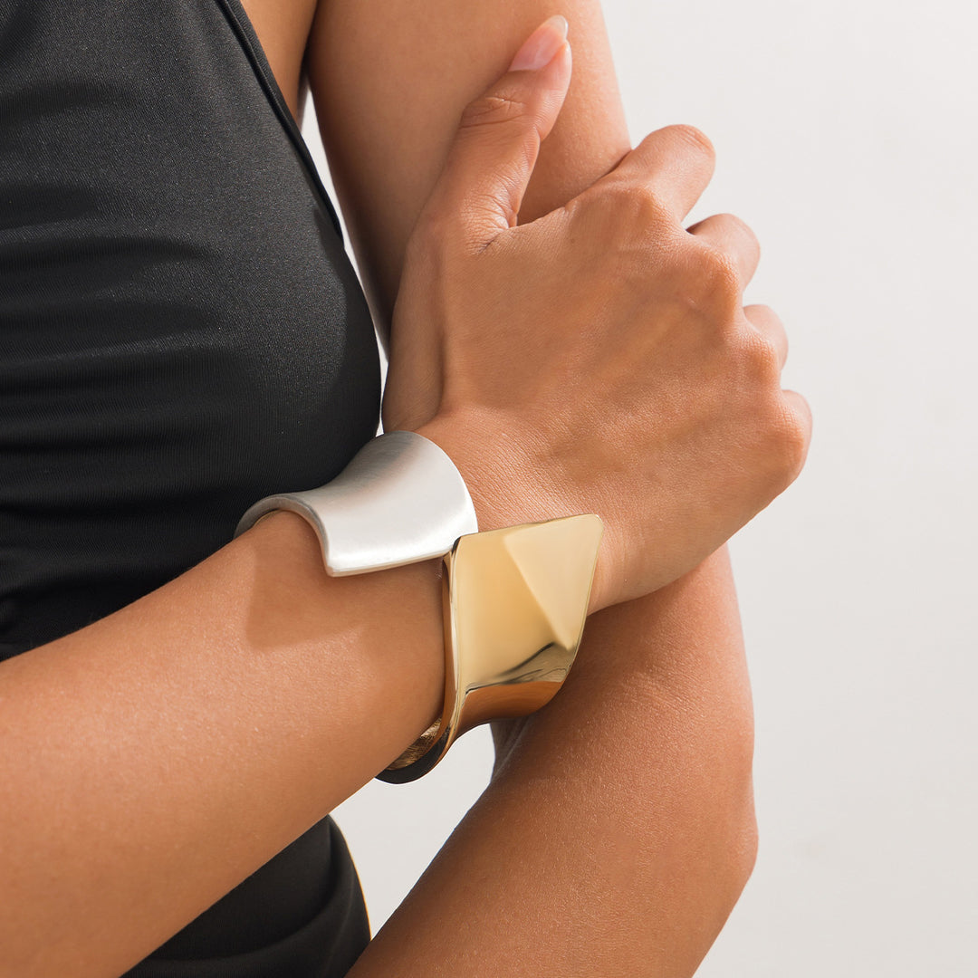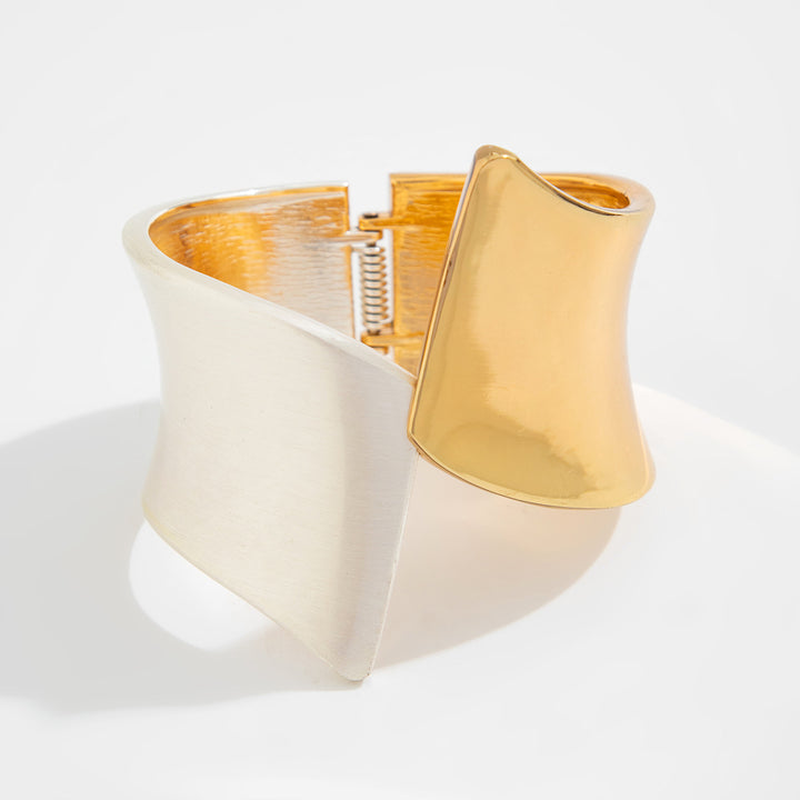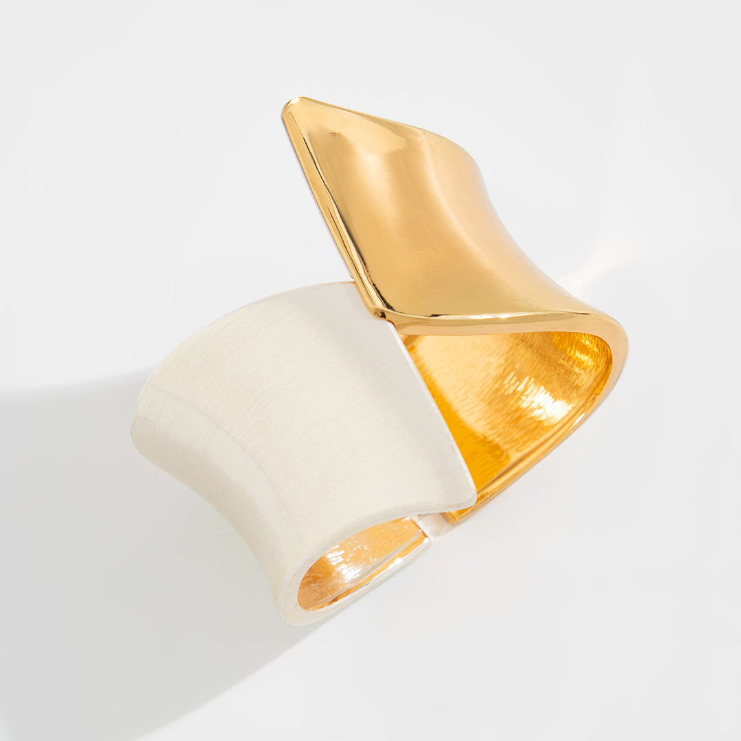 These sculptural two-tone earrings feature a bold, asymmetrical design that elegantly wraps around the ear. With one side finished in brushed silver and the other in polished gold, they create a striking contrast that adds instant modern edge to any outfit. Lightweight and statement-worthy, they’re perfect for both elevated daywear and chic evenings out.