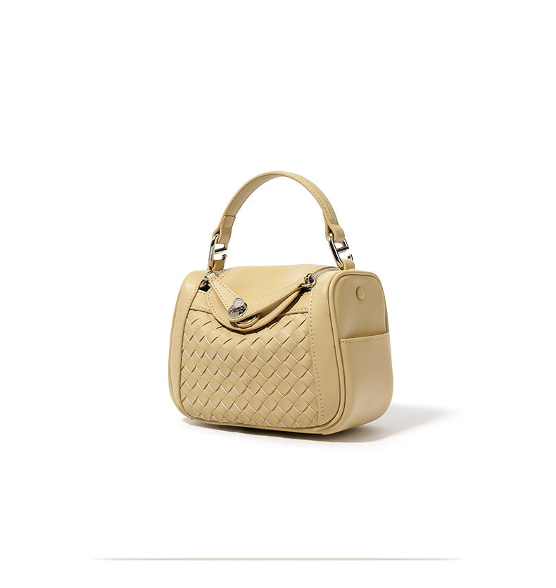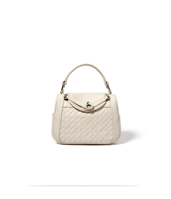 Petite and structured, this cream mini handbag features a delicate woven texture and flap closure with a metallic buckle. A timeless top-handle design ideal for refined everyday looks.