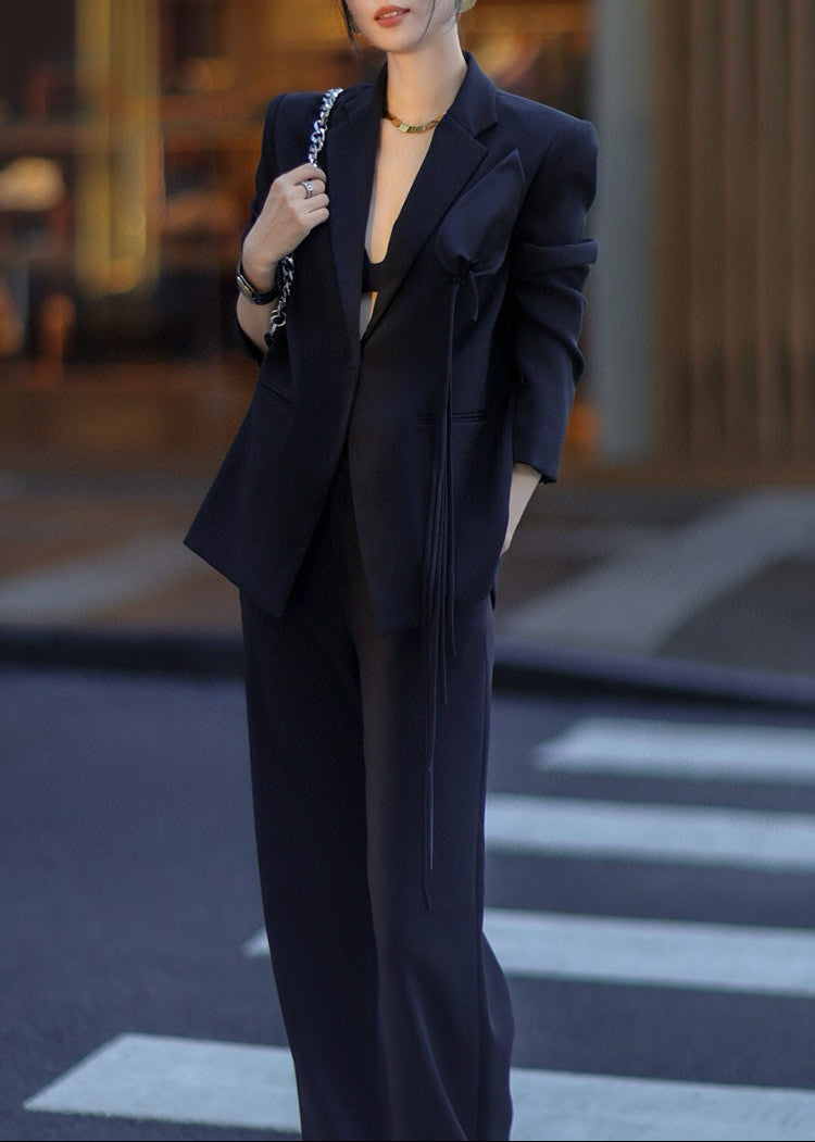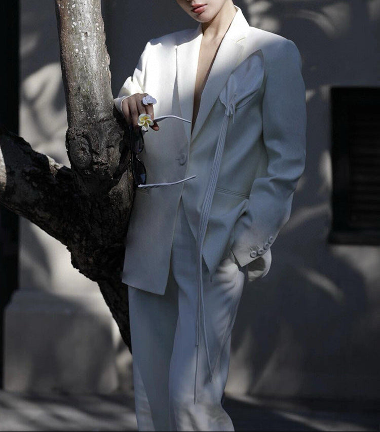 A refined all-white ensemble featuring a structured blazer adorned with a flowing satin drape and sculpted lapel detailing. Paired with fluid wide-leg trousers for an effortlessly elegant, minimalist look—perfect for modern evenings, luxury events, and statement entrances.