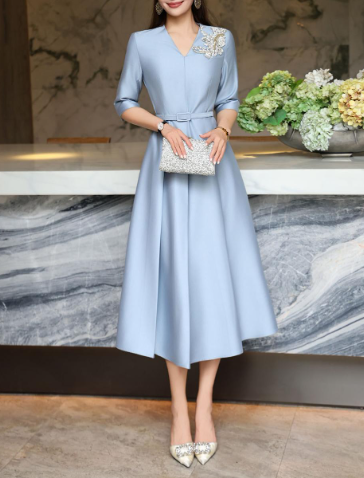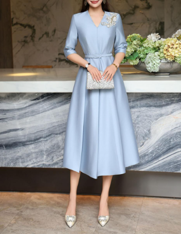 A refined midnight-navy A-line dress featuring a flattering V-neckline, a cinched waist, and a soft structured flare. Finished with a stunning floral crystal embellishment on the shoulder—perfect for elegant dinners, formal gatherings, and graceful evening occasions.