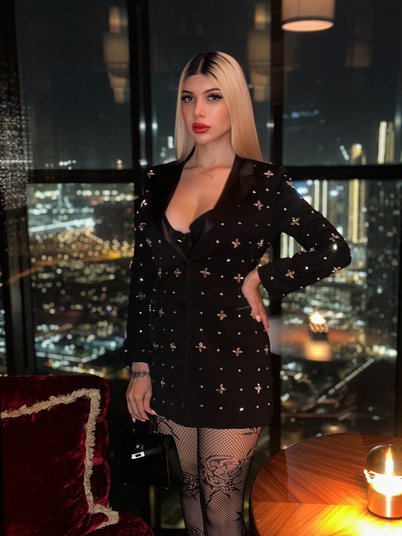 粗犷的精致与现代的闪耀在这款醒目的西装外套中相遇。 这款黑色西装外套采用结构化的双排扣轮廓设计,配有锋利的肩部、缎面翻领,以及全身的水晶装饰,形成别致的十字图案。合身的剪裁修饰腰部,而迷你长度则增添了俏皮、时尚前卫的气息。可单独作为连衣裙穿着,也可搭配修身裤子,展现强大的精致外观。