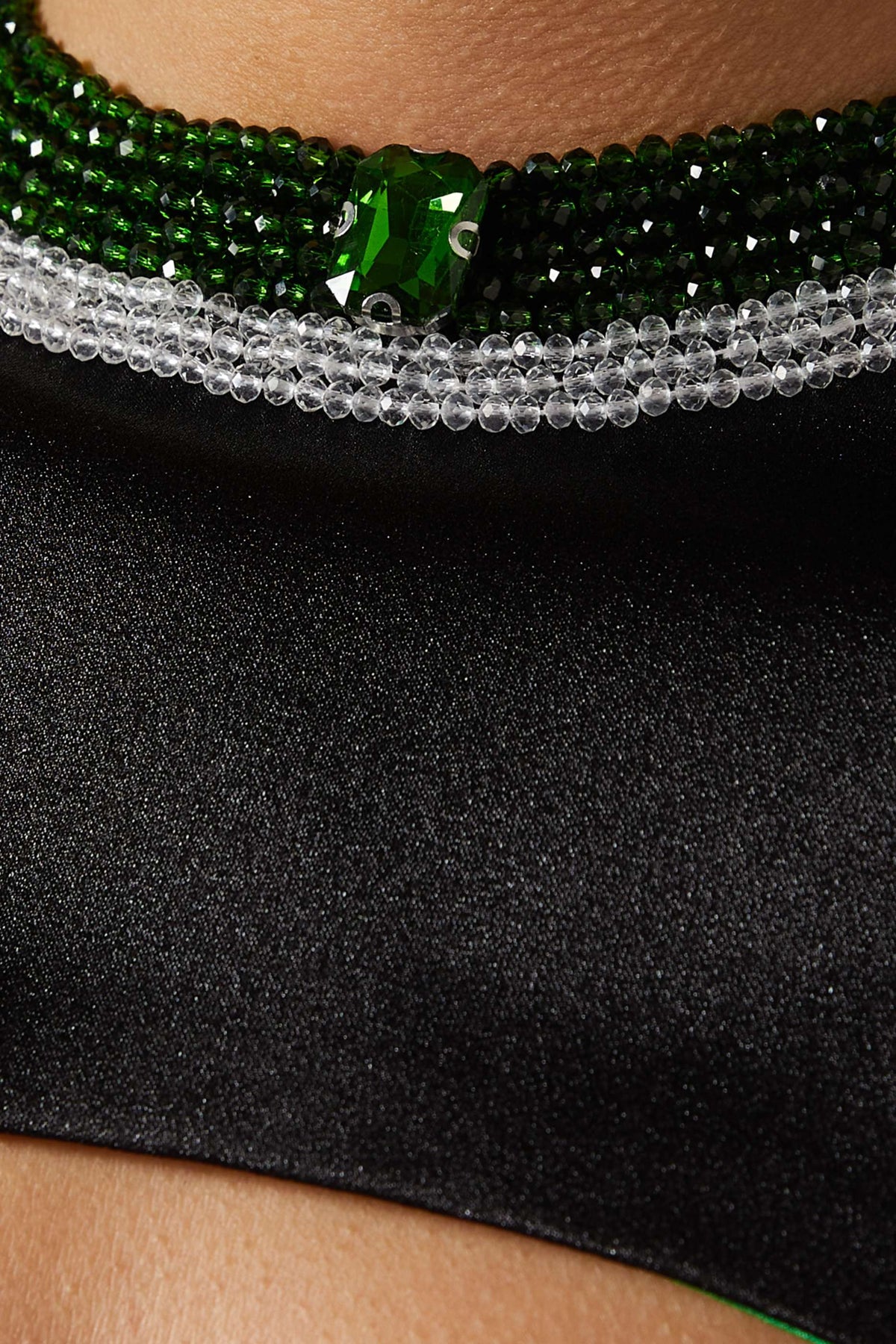 Striking black gown featuring a structured cape overlay with a front cutout and subtle green lining. The fitted silhouette and jeweled neckline create a bold, modern look with refined sophistication.