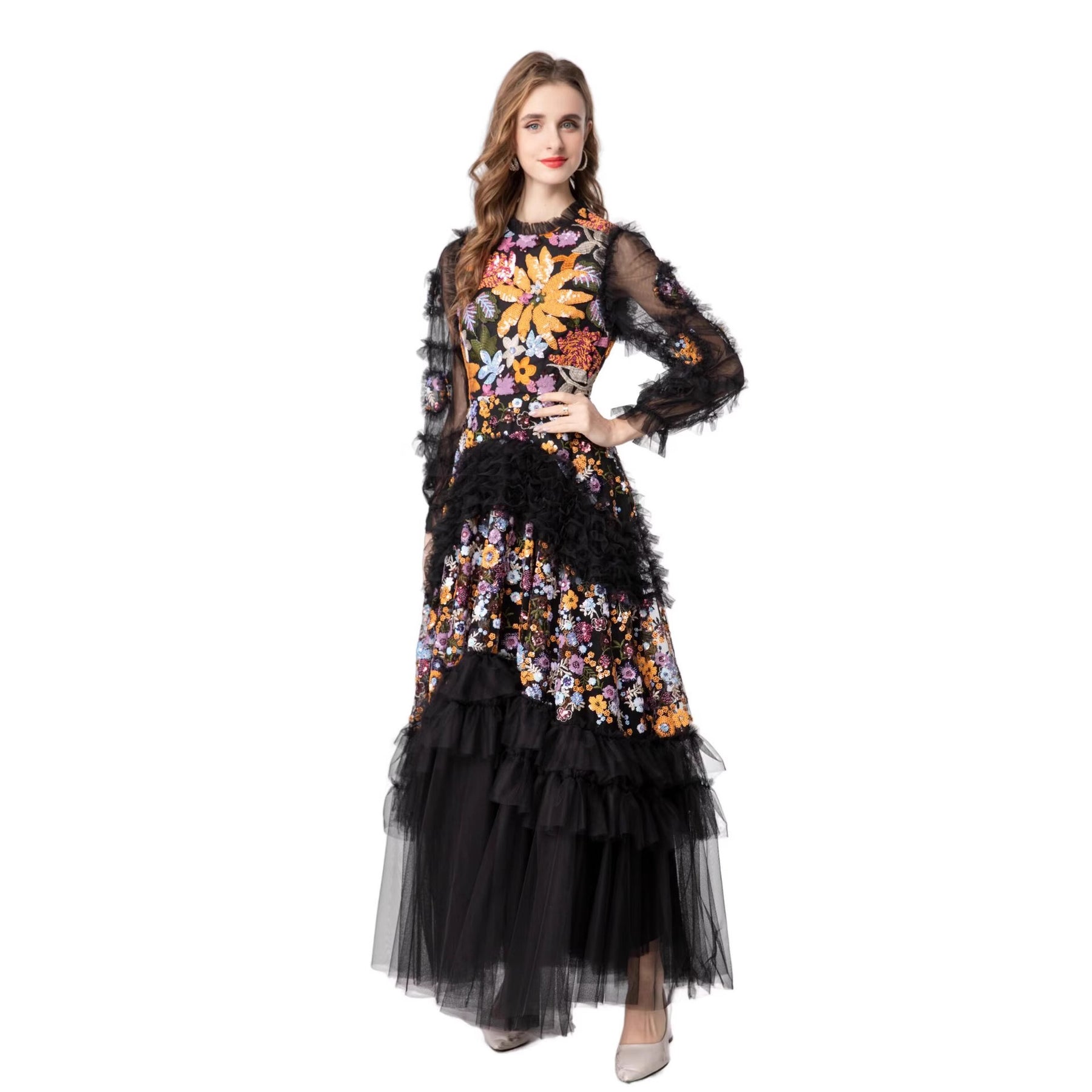 Stunning black tulle gown adorned with vibrant floral embroidery in multicolored threads. Designed with layered ruffles, sheer puff sleeves, and a graceful full skirt, this dress blends dramatic charm with couture-level artistry—perfect for galas and red-carpet events.