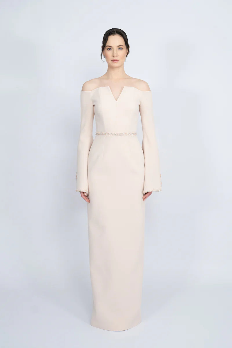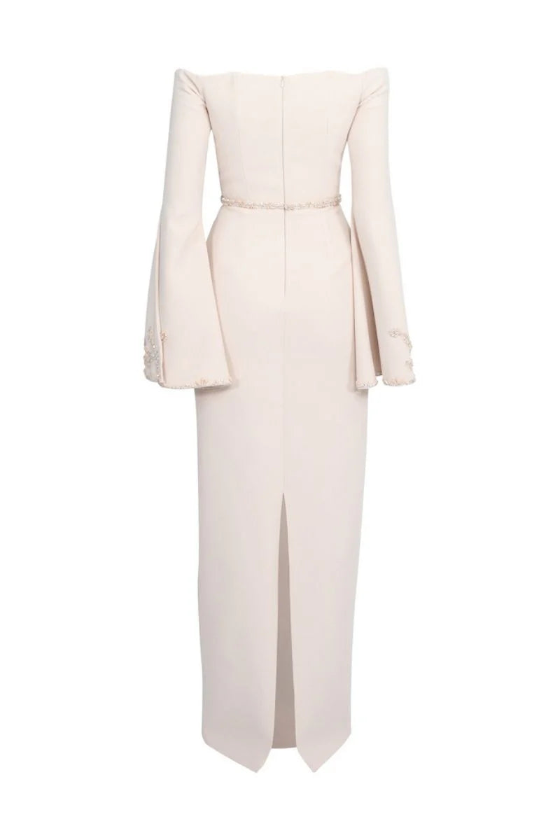 off-shoulder column gown with embroidered flared sleeves – BLUSHE